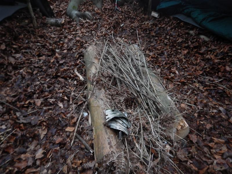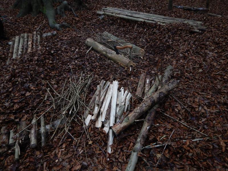 Die langen Stämme rechts und links sind das zu dem Zeitpunkt noch entstehende Trapperbett und sind kein Brennstoff, alles andere hingegen schon. Wir hatten hier Glück, dass einiges totes Hartholz zu finden war, was eine Weile gut brannte, insgesamt hätten wir aber noch mehr gebrauchen können.