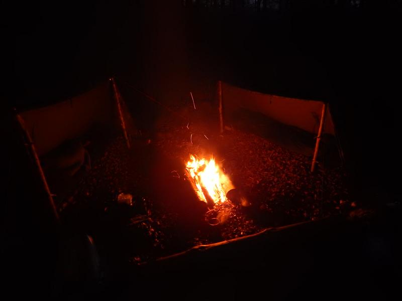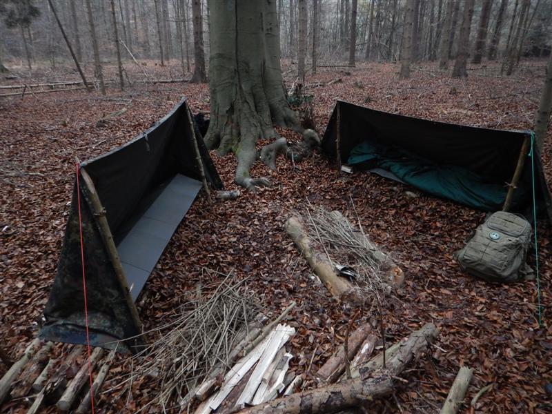 Hier sieht man schon ein wenig besser den Aufbau. Wir haben jeweils unsere BW Zeltbahn genutzt, die nicht nur ggf. vor Regen schützt, sondern hier auch als Wärmefang dient. Man könnte noch etwas näher an das Feuer gehen, aber viel Näher sollte es nicht sein, die Abstrahlhitze reicht vollkommen aus. Wenn es tatsächlich geregnet hätte oder Regen angesagt worden wäre, hätte man noch ein Tarp über das Feuer spannen müssen. Dabei sollte man darauf achten ein robustes Tarp zu nehmen und keines, dass aus Plastik besteht, denn auch hier besteht wieder die Gefahr von bösem Lochfraß. 😉