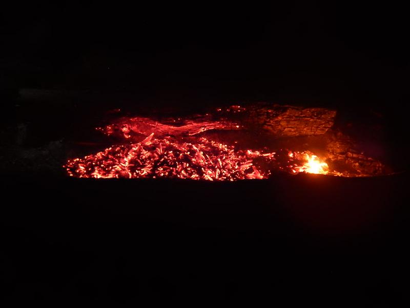Nach und nach wirft man jetzt die größeren Stücke hinein, bis das Feuer soweit ist, dass man die ganz großen Brocken hineinwerfen kann. Wir wollen schließlich, dass unser Feuer lange brennt und wir eine heiße Glut bekommen, denn die Glut ist es, die am längsten wärmt. Auf dem nächsten Bild ist ein schönes Glutbett zu sehen.